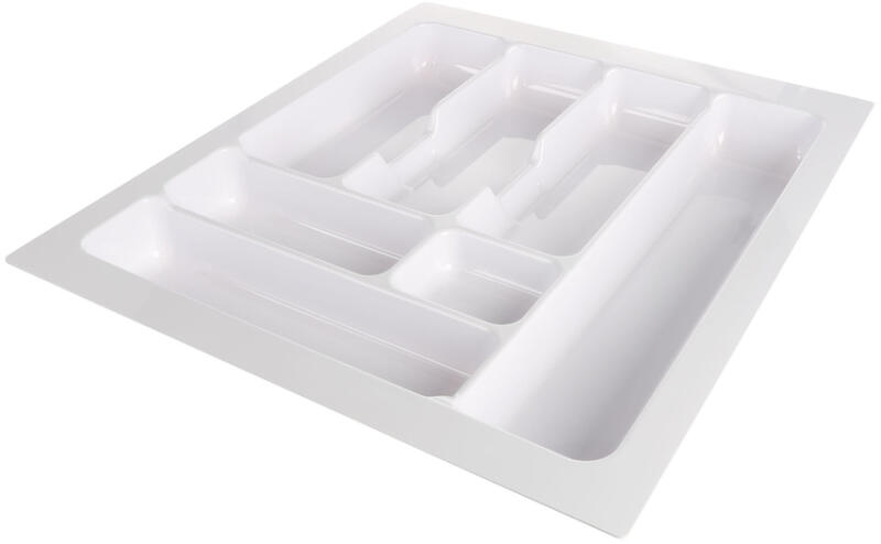 Műanyag evőeszköztartó felső fiókókhoz. Könnyen méretre vágható éles késsel vagy fűrésszel. A mélységi méret megfelelő a legtöbb 500 mm hosszú fióksínhez.