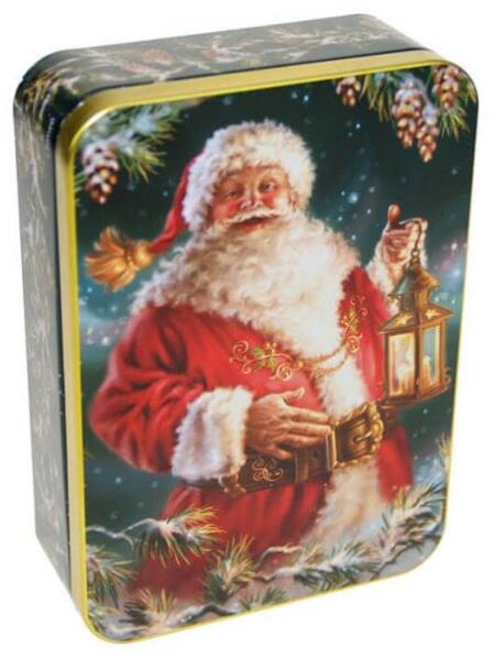 Gyönyörű Télapós mintájú fémdoboz, mely tökéletes kekszek, édességek vagy kisebb tárgyak tárolására, illetve használható ajándékcsomagoláshoz is, mely örömet és meghittséget hoz az ajándékozottnak. Mérete: 14,2x3,1x10,1 cm. Anyaga: fém.