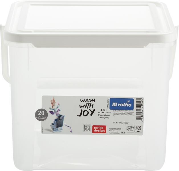 Műanyag tartály mosópor vagy egyéb kisebb háztartási cikkek tárolására. A konténer fogantyúval van felszerelve a könnyű hordozhatóság érdekében. Minőségi kivitelezés a svájci Rotho márkától. Termék részletek: mérete : 21 x 23 x 18 cm űrtartalom: 4,5 l anyaga: műanyag szín: átlátszó / fehér Csomag tartalma: 1x doboz
