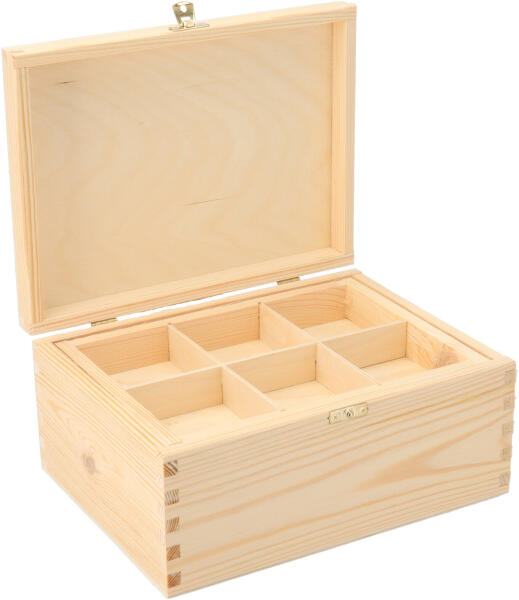 Ez a gyönyörű borovifenyőfa doboz praktikus fedéllel és 6 rekesszel rendelkezik a kincsek tárolására. A dobozt ékszereknek, de fűszereknek is használhatja. Az ezermesterek használhatják a műhelyben, és szépen szétoszthatják a csavarokat és anyákat vagy más apróságokat. Az egyes rekeszek mérete7,6cm x 8 cm. Ha ez a doboz nem tetszik Önnek, rengeteg másdoboz, van, amelye