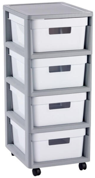 Curver "Infinity" Fiókos Tároló 4X11L Szürke/fehér színű Termék leírás: A négy lábon álló, 4 fiókos skandináv stílusú tároló, amely egyszerű, mégis modern színeivel megállja helyét minden stílusú fürdőszobában, hálószobában, szalonban, irodában. A fiókok egyenként 11l űrtartalmúak, fogantyúval ellátva a könnyű kezelhetőség érdekében, melyhez hozzájár