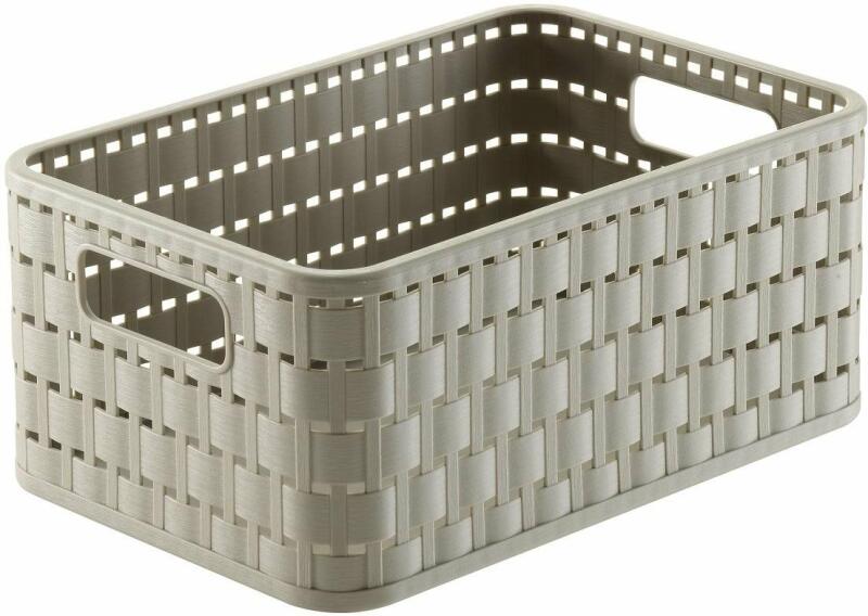 Gyártó: CURVER Modell: Rattan hatású kosár 18L Leírás: Rattan hatású tárolódoboz iratok, játékok, ruhaneműk, tisztítószerek, fürdőszobai kiegészítők tárolására Anyaga: műanyag Méret: 385x290x172 mm