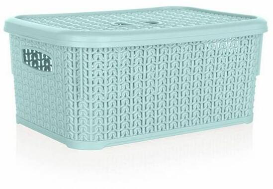 6 literes műanyag rattan kosár tetővel mentazöld színben. Praktikus tároló otthonában. Sokrétűen használható tároláshoz, rendszerezés. Praktikus tároló fürdőszobában, hálószobában, gardróbszekrényben, konyhában. A kosár műanyagból készült, ami garantálja a tartósságot és hosszú élettartamot. Mérete: 28,5x12,5x20 cm.