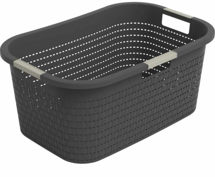 Műanyag kosár a tiszta ruhákhoz, rattan szövés stílusban. Modern dizájn és minőségi kivitelezés. Űrtartalom 40 L. A kosár tartós és erős műanyagból készült. Minőségi kivitelezés a svájci Rotho márkától. Termék részletek: méretek: 58 x 38,9 x 25 cm (h x sz x ma) anyaga: műanyag szín: antracit súlya: 0,83 kg Csomag tartalma: 1 x műanyag kosár