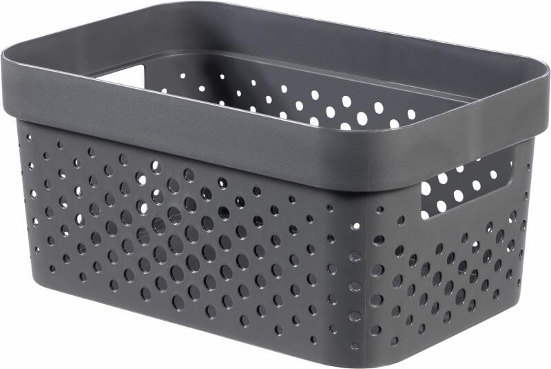 CURVER INFINITY kosár 11L, grafitszürke 245679 (04750-G43) Praktikus tárolódoboz INFINITY a Curver márkától, aminek imádni fogod a skandináv stílus ihlette modern dizájnját. A 11 l űrtartalmú tárolódoboz ellenálló újrahasznosított műanyagból készült. A doboz fogantyúval van ellátva a könnyű mozgathatóság érdekében, ami nem foglal el további helyet. Műszaki adatok: