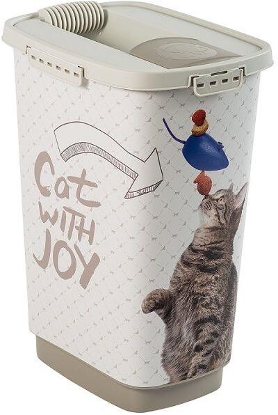 Egy praktikus lapát is jár hozzá. Kihajtható adagoló a fedélben a takarmány egyszerű adagolásához és kiürítéséhez. Megbízható légmentesen záródó fedél az oldalsó kapcsoknak köszönhetően. Az ergonomikus forma kényelmes fogást tesz lehetővé. Élelmiszer-minőségű műanyagból (PP) készült. Szép "CAT WITH JOY" kisállatmintás. Minőség a svájci Rotho márkától.