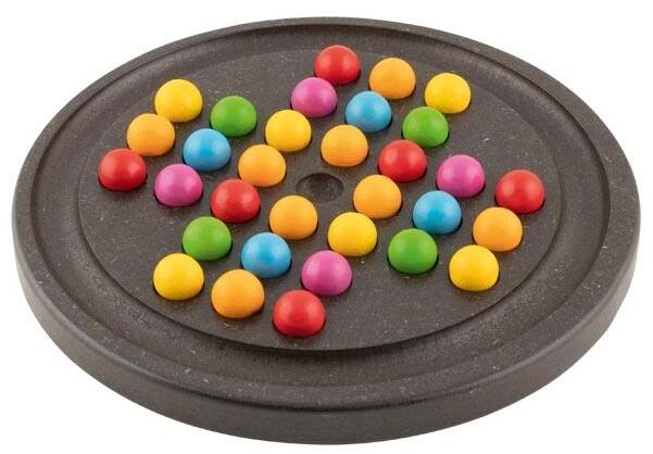 Goki színes golyós fa szoliter 1 vagy két fő részére. Egy pasziánsz típusú játék, amely a játék öröméről és a változatosságról szól. A fa golyók kiváló minőségűek, színesek, fényesek és mély kontrasztot alkotnak a strapabíró MDF-ből készült antracit színű játéktáblával. A remélhetőleg nagyon sok golyó tárolására szolgáló peremvájat rendkívül pr