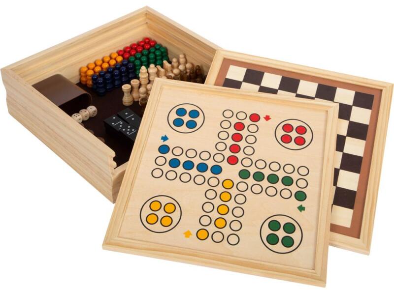 Small foot 12322 klasszikus társasjátékok egy gyűjteményben fadobozban, 7 különböző, örök érvényű társasjáték fából. Ez a játékgyűjtemény nagyszerű az egész család számára, és tartalmazza az összes fontos klasszikus és népszerű társasjátékot! Legyen szó dominóról, ludóról, sakkról, malomról, backgammonról, Halmáról vagy más játékról – ez az erős