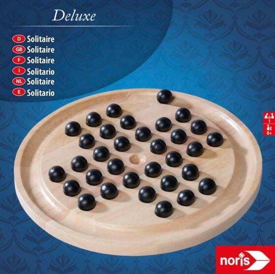 Noris - Deluxe Szoliter (6102032) - A golyókkal játszott szoliter egy olyan táblás játék, amelyet egy kisebb, kerek alakú fa táblán játszanak. A játék célja, hogy a lehető legtöbb golyót távolítsuk el a tábláról, amíg csak egy marad. Először a táblára golyókat helyezünk. A klasszikus kezdő elrendezés egy középső golyóból áll, amelyet körülvesz a többi golyó.