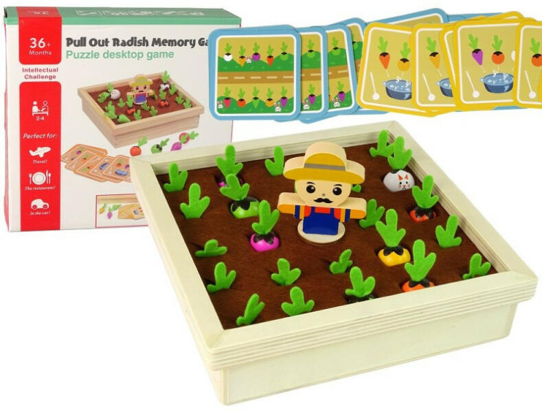 Fa memória és oktató játék - Ültess zöldségeket! Fa memória és oktató játék - Ültess zöldségeket! A játék nagyszerű szórakozást és rengeteg nevetést ígér mindenki számára. Vegyük elő a játéktáblát és minden nyílásba dugjunk egy-egy zöldséget vagy nyuszit úgy, hogy csak a zöld levele lógjon ki, a középsőbe pedig tegyük be a kertészt! Minden játékos h