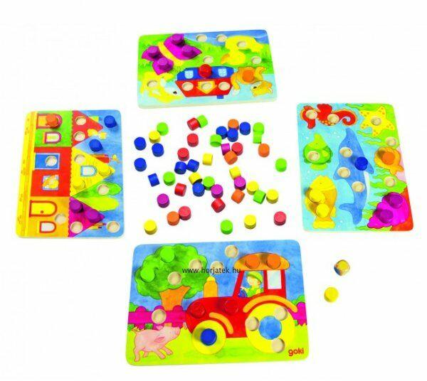 Ismerd meg játszva az színeket és formákat! A társasjáték tartalma: 4 fa játéktábla különböző helyszínekkel:otthon, a farmon, az akváriumban, a tónál 6 x 12 db színbábu citromsárga, piros, lila, kék, zöld és narancssárga színekben 1 db színes dobókocka.