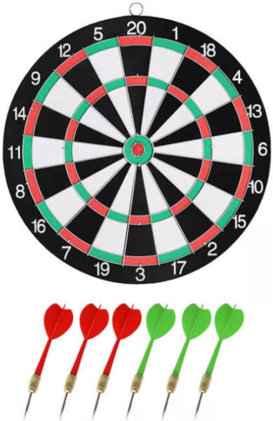 RAKTÁRRÓL AZONNAL! Darts tábla 37cm, kétoldalú 6 db fémhegyű nyíllal A Darts egy olyan játék és sport, melynek során apró nyilakkal dobnak egy kör alakú céltábla különböző pontértékű szektoraira. A játék célja a versenyszabályban meghatározott számú leget nyerni. Egy leg az 501 pontról indul és a játékos által dobott pontot mindig kivonják a maradék pontjaibó