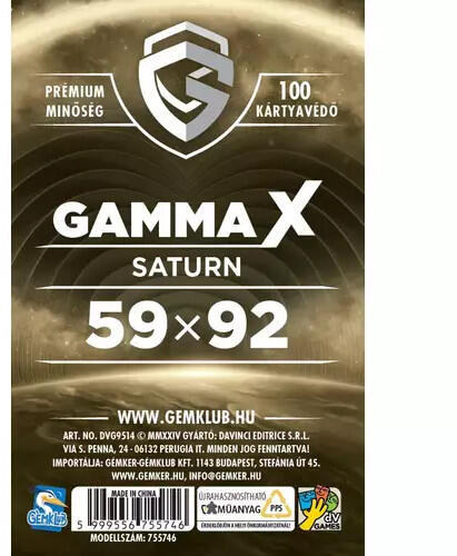 Prémium minőségű kártyavédő a kártyáid maximális védelméért. A GK Gamma X - Saturn kártyavédő ideális választás minden társasjáték-rajongónak, aki szeretné hosszú távon megőrizni kártyái állapotát. A csomag 100 db kártyavédőt tartalmaz, így elegendő egy teljes játék kártyakészletének védelméhez. Főbb jellemzők: Prémium minőségű anyagok 59x92 mm 100