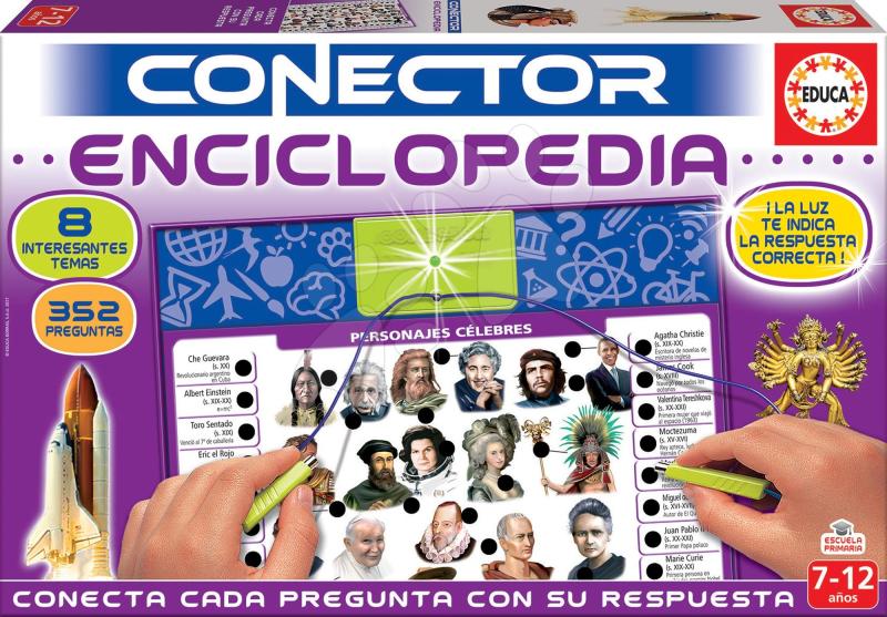 Társasjáték Conector Enciclopedia egy igazán egyedi spanyol nyelvű gyerek társasjáték, amely 7-től 12 éves korig ajánlott a gyerkőcöknek. Fő részét ennek a játéknak ismert emberek, dinoszauruszok, emberi test, ismert építmények, zászlók, történelem és sok más ábrával ellátott játéktáblák alkotják. A játékhoz 352 kérdés tartozik, ezek segítségével a gyereke