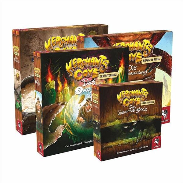 A csomag tartalmazza a The Innkeeper; The Oracle és a The Dragon Rancher kiegészítők német nyelvű kiadását! A kiegészítők önállóan nem játszhatóak, szükséges hozzá a Merchants Cove alapjáték!