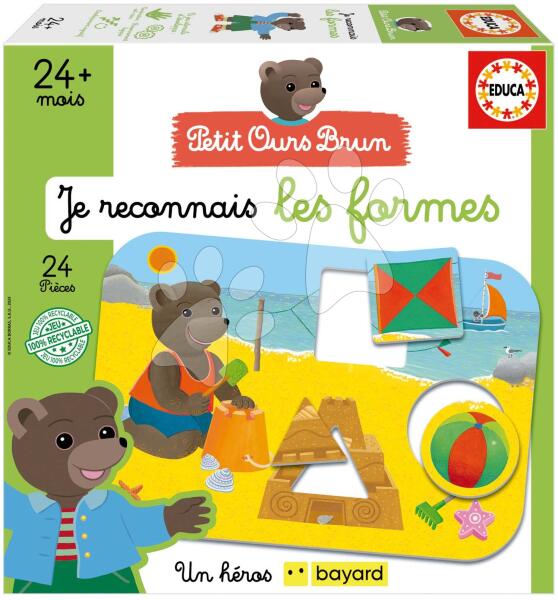 Ismerkedem a geometriai alakzatokkal oktató játék a spanyol Educa gyártótól gyerekeknek 2 éves kortól. Az egyedi társasjáték fő részét 4 db mackókat ábrázoló kártya alkotja. A gyerekek feladata a geometriai alakzatok (négyzet, háromszög, kör, téglalap) segítségével a megfelelő helyre helyezni a kártyákat. Ezáltal játékos formában gyakorolják az asszociációs ké