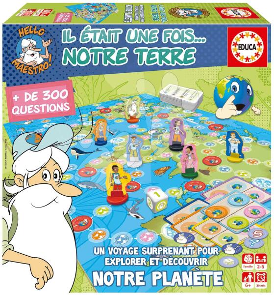 Hello Maestro társasjáték a spanyol Educa gyártó műhelyéből. Remek szórakozás minden kiváncsi gyerkőc számára 6 éves kortól. A gyerekeknek játék közben különböző kérdésekre válaszolnak a Föld bolygóról, miközben rengeteg új információval gazdagodnak. A játék 2-6 játékos számára alkalmas, játéktáblát, zsetonokat, figurákat, játék kockát és 96 kártyá