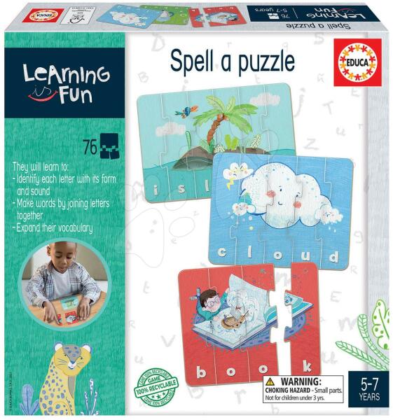 Oktatójáték legkisebbeknek Spell a Puzzle a spanyol Educa műhelyéből kiváló játék 5-tól 7 éves gyerkőcök részére, akik szivesen ismerkednek új dolgokkal. Különleges angol nyelvű játék 76 minőségi puzzle kártyából áll, melyeket ha helyesen rakunk ki 16 képet jelenit meg különböző tárgyak, állatok és növények megnevezésével. Gyerekek ezen a játékon keresztü