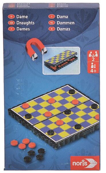 Noris Mágneses társasjáték - Dáma A klasszikus játék, a Dáma egy olyan formát kapott, amelyet akár egy hosszú, zötykölődő utazás során is elő lehet venni unaloműzőnek. A mágneses táblán stabilan megállnak a bábuk, és a játék végeztével az összehajtható játéktáblában lehet tárolni a kisebb alkatrészeket. A játékot ketten játsszák. A játéknak sok változat