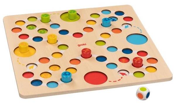 Goki 56785 Ki nevet a végén? társasjáték fatáblán színes mezőkkel első táblás társasjátéknak. Gyönyörű játéktábla a klasszikus Ludo társasjátékhoz ezúttal a legkisebbeknek. Számolási készségekkel még nem rendelkező óvodások is részt vehetnek a társasjátékban. Mivel ennek a korosztálynak a társasjátékokhoz szükséges koncentrációja még kevésbé erős, e