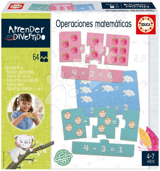 Oktatójáték Matematikai egyenletek a spanyol Educa gyártótól gyerekeknek 4 éves kortól. A fantasztikus didaktikus játék 64 puzzle elemet tartalmaz, ezeket a gyerekek színek, számok illetve hasonló ábrák alapján próbálják összeilleszteni. Az így kialakított egységes kép egy bizonyos matematikai egyenletet ábrázol, melynek segítségével a gyerkőcök megtanulnak tízig sz