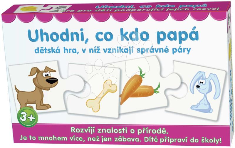 Párosító társasjáték Találd ki mit eszik a neves Dohány gyártó műhelyéből egy igazán kiváló ajándék gyerekek részére már 3 éves kortól. A játék célja a megfelelő képpárok megtalálása , jelen esetben állatok és eledelük összekapcsolása. Az egyes ábrákkal ellátott kártyák úgy illeszkednek egymásba, mint a puzzle darabjai. A cseh nyelvű oktatójáték hossz