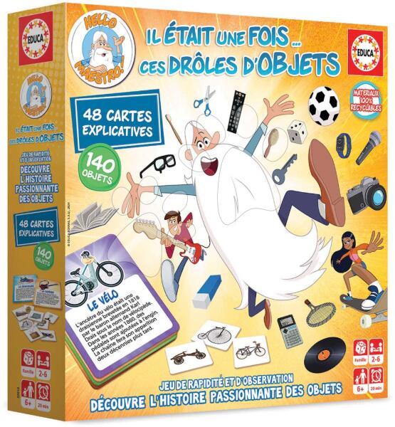 Társasjáték Egyszer volt a tárgyak a spanyol Educa gyártótól gyerekeknek 6 éves kortól. A francia nyelvű társasjáték 48 db kártyát leírással és 140 db képeskártyát tartalmaz, melyek segítségével a gyerekek sok új információval gazdagodnak. Az oktató játék célja a különböző tárgyak történetének és fejlődésüknek a magyarázata. A játék 2-6 játékosnak al