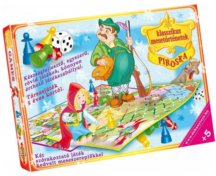 Klasszikus társasjáték Piroska egy csodálatos játék mesemotívummal gyerekeknek 5 éves kortól . Gyerek társasjáték hagyományos Ki nevet a végén stílusban, tehát a szabályok nagyon egyszerűek. Talál a csomagolásban 2 játéktáblát gyönyörű színes képekkel a népszerű Piroska és a farkas meséből, játékfigurákat és dobókockát . Mesebeli játék , amely lerövidít