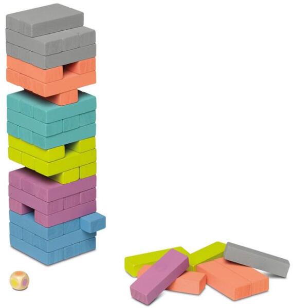 Cayro toronyépítő társasjáték fából 54 darab pasztell színes fahasábbal és színoldalas dobókockával. Jenga társasjáték magas minőségű, festett, pasztell színű fahasábokkal, újra hasznosított kartonból készült dobozzal. Toronyépítő játék kedves választás azoknak, akik szeretik az egyensúlyozó játékokat, a vidám perceket barátokkal és családdal. Már a legk