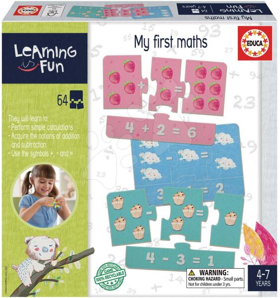Oktatójáték legkisebbeknek My first Maths a spanyol Educa műhelyéből játékos módon ismerteti meg a gyerkőcökkel már 4-től 7 éves korig a matematikai műveletek alapjait. Időtlen játék 64 minőségi puzzle kártyából áll, melyeket ha helyesen rakunk ki 16 képet jelenit meg számokkal és vidám ábrákkal. Gyerekek ezen a játékon keresztül megtanulják a képeket megkülönb