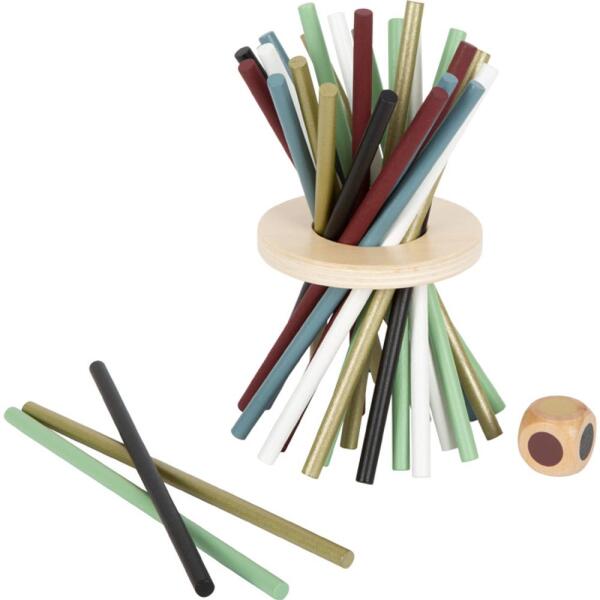 Small foot 12382 függőleges mikádó Gold Edition színvilágban fa gyűrűvel és színes dobókockával. Egy teljesen újfajta Mikado! Ennél a függőleges állású ügyességi játéknál a natúr, kezeletlen fa egyensúlyozó gyűrű biztosítja, hogy a mikádó fapálcák színes csokorba kerüljenek. A színes kocka jelzi, hogy melyik pálcát kell eltávolítani. De vigyázz: aki a gyű