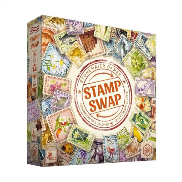 Paul Salomon tervező (Honey Buzz, Genotype) a bélyeggyűjtést eleveníti fel az asztalon a Stamp Swap-ben! Válassz a lefordított és felfordított lapokból álló publikus készletből (néhány bónuszkártyával együtt), majd oszd őket egyidejűleg 2 csoportra. Az egyik csoportot egy másik játékostól választod ki, és megtartod azt a csoportodat, amelyet nem választottak ki. Minden