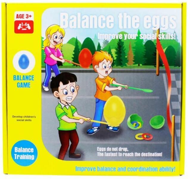 Tojás a kanálon egyensúlyozós társasjáték Partikhoz, vetélkedőkhöz, sorjétékokhoz, vagy egyszerűen csak otthon a családban játszható egyensúlyozós társasjáték. Fejleszti az egyensúlyérzéket, mozgáskordinációt és nem utolsósorban nagyon szórakoztató. Tartalma: 4 db különböző színű műanyag tojás 4 db egyensúlyozó kanál 24 db karika A játék menete: 1. Max.