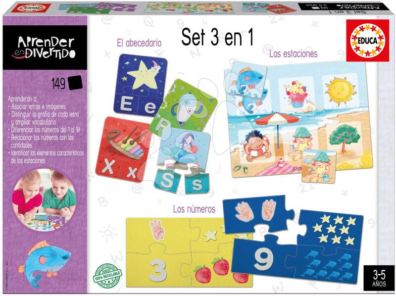 Oktatójáték 3in1 Multi a spanyol Educa gyártótól gyerekeknek 3 éves kortól. A többfunkciós didaktikus készletben 3 készségfejlesztő játékot találunk. A gyerekek feladata hozzárendelni a kártyákat az évszakokat ábrázoló tematikus képekhez, összekapcsolni a számokat illetve betűket a megfelelő képekkel. A játékkészlet kivitelezése lenyűgöző, maga a játék hozzá