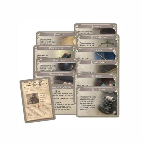 Cape May fejlődésének kezdetén két véletlenszerűen felcsapott kártya közül választhatod ki a hivatásodat. Aktiváld ezt a játékonként egyszeri előnyt, hogy maximalizáld a vagyonodat, és Cape May legsikeresebb fejlesztőjeként növeld a presztízsedet! Ez a promo csomag tíz hivatáskártyát és egy szabálykártyát tartalmaz. Tartalmaz továbbá egy bónusz eseménykártyát i