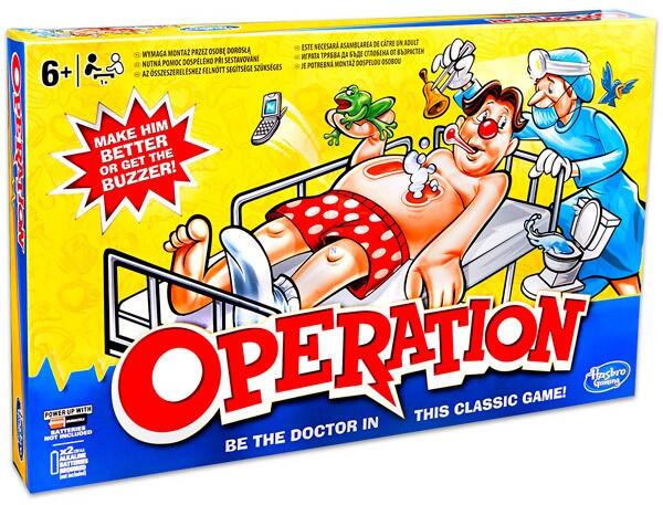 Mentsd meg a beteg életét a népszerű Operáció társasjátékban! Játék egyedül is játszható, de társaságban még élvezetesebb! A társasjáték működéséhez 2 db AA 1,5V elem szükséges, melyeket a csomagolás nem tartalmaz. A csomagolás mérete: 40 x 25 x 5 cm.