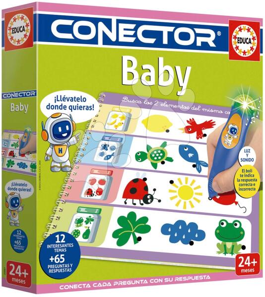 Társasjáték Conector Baby a spanyol Educa gyártótól gyerekeknek 2 éves kortól. A könyvformájú társasjáték 12 lapot tartalmaz 65 kérdéssel, melyek segítségével a gyerekek gyakorolják a megfigyelő készséget. A Conector játék lényege a képek megfigyelésének, érzékelésének és vizuális megkülönböztetésének fejlesztése. A gyerekek a kérdéseket a játéktáblán
