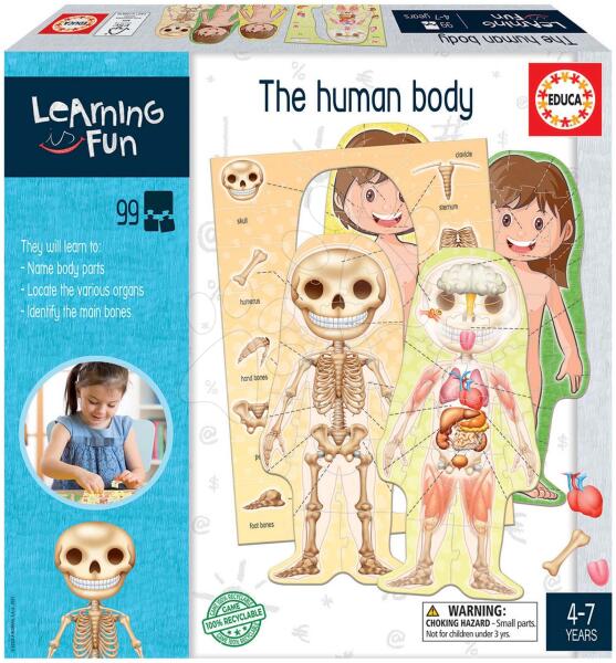 Oktatójáték legkisebbeknek The Human Body a spanyol Educa műhelyéből egy nagyszerű játék kis orvosok és orvosnők részére már 4 éves kortól. Az emberi test anatómiáját megismertető időtlen játék 99 kártyából áll. Gyerkőc feladata lesz az ember test kirakása az egyes elemekből, miközben segitségére lesz a test részeinek megnevezése is angol nyelven , igy szókincse