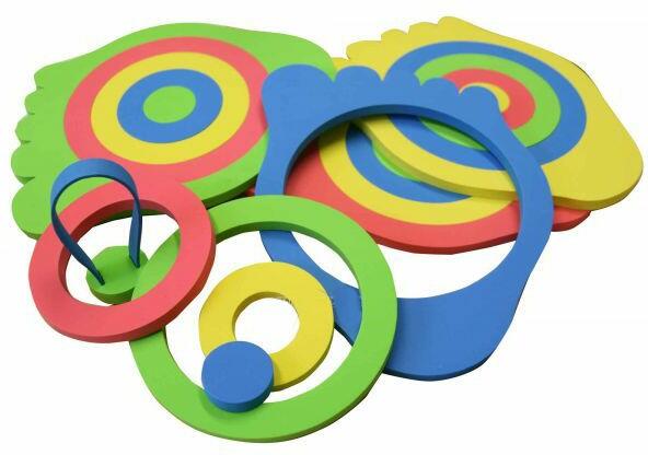 Szórjuk szét a padlón a különböző színű elemeket. A lábunkra csatolt kiinduló korong segítségével szedjük össze növekvő sorrendben a habszivacs gyűrűket. A mintakártyák felhasználásával színenkénti sorrendjüket is meghatározhatjuk. Figyeljünk, hogy végeredményként a feladatot elvégző végtaggal azonos - jobb, vagy bal - formát kapjunk!Fejlesztési területek:- m