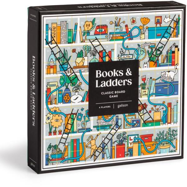 A Galison Books and Ladders Classic Társasjátéka a klasszikus Snakes & Ladders- Kígyók és létrák játék könyves változata. A játéktábla egy könyvespolcot ábrázol, ahol létrákon tudsz feljebb jutni ha szerencsésen dobsz, de a könyvjelző szalagokon lepottyanhatsz. A játék különlegtessége abban rejlik, hogy Hyesu Lee, egy szöuli születésű, New York-i illusztrátor,