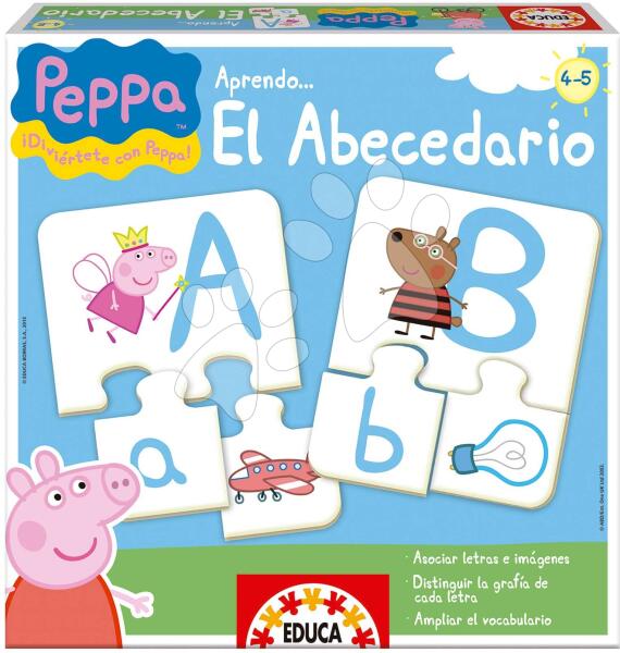 Ismerkedem az ábécével oktatójáték a spanyol Educa gyártótól gyerekeknek 4 éves kortól. A spanyol nyelvű szórakoztató társasjáték bemutatja az ábécé betűit. A puzzle 81 elemből áll, ezekből 27 db Peppa Pig motívumú és betűket ábrázoló kép rakható össze. A gyerekek feladata párosítani a képeket a megfelelő betűkkel . A játék nagyon egyszerű, ám érdekes. H