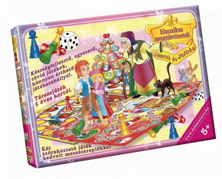 Klasszikus társasjáték Jancsi és Juliska egy csodálatos játék mesemotívummal gyerekeknek 5 éves kortól . Gyerek társasjáték hagyományos Ki nevet a végén stílusban, tehát a szabályok nagyon egyszerűek. Talál a csomagolásban 2 játéktáblát gyönyörű színes képekkel a népszerű Jancsi és Juliska meséből, játékfigurákat és dobókockát . Mesebeli játék , amely le
