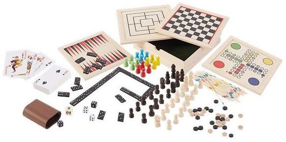 Számos társasjátékot tartalmazó készlet 2 vagy több játékos részére. Méretei kb. 23x23 cm. A szett tartalma: 1 játéktábla sakk/dáma/ki nevet a végén 1 játéktábla malom/ostábla 4x4 színes kúp a ki nevet a végén játékhoz 41 színes pálca Sakkfigurák 2x15 dáma, malom korong 28 db dominó 5 dobókocka Dobókocka kupa 1 pakli francia kártya