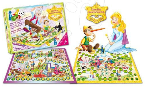 Klasszikus társasjáték Pinocchio egy csodálatos játék mesemotívummal gyerekeknek 5 éves kortól . Gyerek társasjáték hagyományos Ki nevet a végén stílusban, tehát a szabályok nagyon egyszerűek. Talál a csomagolásban 2 játéktáblát gyönyörű színes képekkel a népszerű Pinocchio meséből, játékfigurákat és dobókockát . Mesebeli játék , amely lerövidíti a hossz