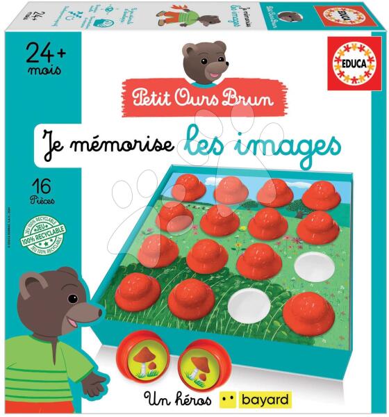 Je mémorise les images oktató játék a spanyol Educa gyártótól gyerekeknek 2 éves kortól. Az egyedi memória játék fő részét egy színes, természeti motívummal díszített színes box alkotja, amely 16 nyílással rendelkezik, ezekbe a gomba alakú pexeszót kell elhelyezni. A gombák alsó részén erdei motívumú ábrák vannak, a gyerekek feladata megtalálni az azonos képeket