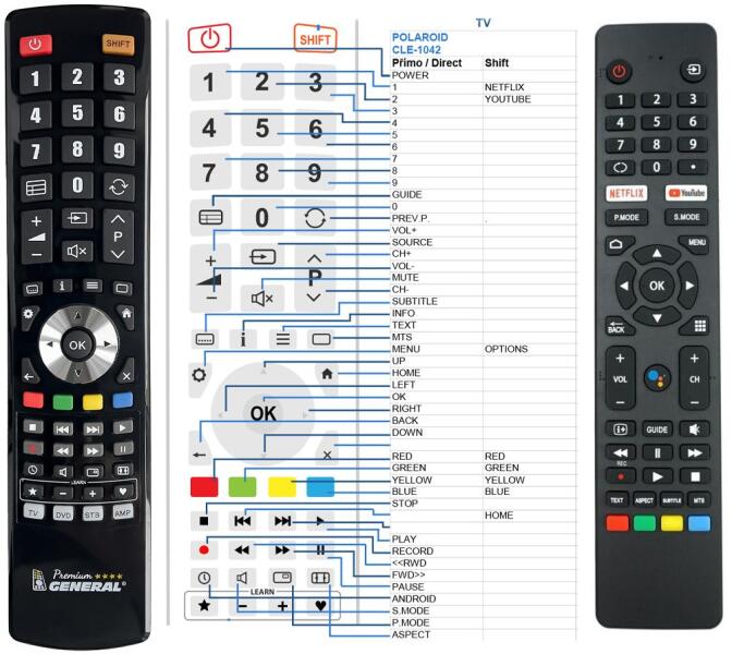 Helyettesítő távirányító POLAROID PL55UHDG, PL65UHDG, TCS65QLEDPR001, TVSAND654KPRO2, TCSAND43UHDPR01 - 100%-os 1:1 arányú helyettesítője az eredeti távirányítónak. A távirányító a POLAROID:PL55UHDG, PL65UHDG, TBSAND65QLED, TCS55BDSPR001, TCS65QLEDPR001, TCSAND43UHDPR01, TCSAND5OUHDPR01, TVSAND654KPRO2. (Előfordulhat, hogy nem minden kompatibilis modell szerepel a listában. Ha