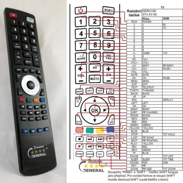 Helyettesítő távirányító GERICOM GTA63HD - 100%-os 1:1 arányú helyettesítője az eredeti távirányítónak. A távirányító a GERICOM:GTA-63HD, GTA63HD, GTV-3201, GTV3201. (Előfordulhat, hogy nem minden kompatibilis modell szerepel a listában. Ha nem biztos benne, csak adja meg a készülékmodelljét (online chat-en vagy e-mailben), és mi azonnal ellenőrizzük, if kompatibilis-e a