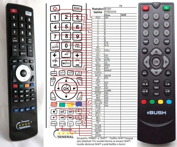 Helyettesítő távirányító BUSH STB202X12 - 100%-os 1:1 arányú helyettesítője az eredeti távirányítónak. A távirányító a BUSH:STB202X12. (Előfordulhat, hogy nem minden kompatibilis modell szerepel a listában. Ha nem biztos benne, csak adja meg a készülékmodelljét (online chat-en vagy e-mailben), és mi azonnal ellenőrizzük, if kompatibilis-e az Ön készülékével. Az elle