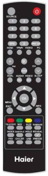 Helyettesítő távirányító HAIER LT19A1, LT22A1, LT26A1, LT32A1, LT32K1, LTF37K1, LTF42K1, LTF47K1 - 100%-os 1:1 arányú helyettesítője az eredeti távirányítónak. A távirányító a HAIER:LT19A1, LT19M1CW, LT22A1, LT22M1CW, LT26A1, LT26K1, LT26M1, LT26M1C, LT32A1, LT32K1, LT32M1, LT32M1C, LT42A1, LTF37K1, LTF42K1, LTF42M1C, LTF47K1. (Előfordulhat, hogy nem minden kompatibilis modell s