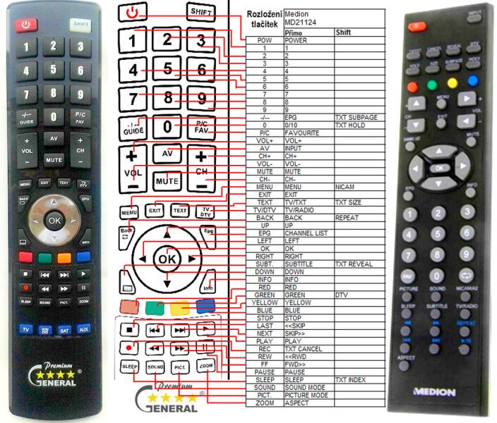 Helyettesítő távirányító MEDION MD21124, MD21174, MD30457, MD30348 - 100%-os 1:1 arányú helyettesítője az eredeti távirányítónak. A távirányító a MEDION:MD21124, MD21174, MD30348, MD30457. (Előfordulhat, hogy nem minden kompatibilis modell szerepel a listában. Ha nem biztos benne, csak adja meg a készülékmodelljét (online chat-en vagy e-mailben), és mi azonnal ellenőrizz